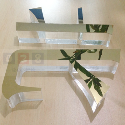 這里的亞克力水晶字是采用四公分的透明亞克力,將亞克力進行雕刻、拋光,表面用玻璃膠粘貼上不銹鋼形成面板制作而成的。